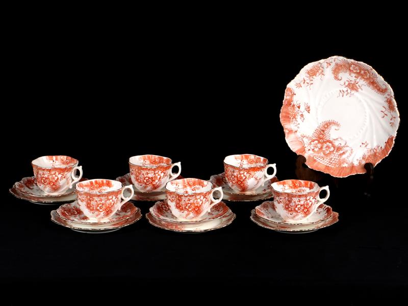 6 ADET 3 LÜ SET, 1 ADET SERVİS TABAĞI. BEYAZ ZEMİN ÜZERİ. TURUNCU RENKLİ BİTKİSEL MOTİFLERLE DEKORLU.