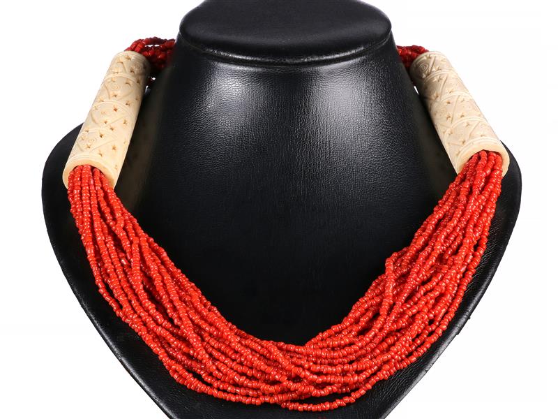 23 SIRA DİZİLİ. KOLYE ORTALARI SİLİNDİR FORMLU KAZIMA VE OYMA İŞÇİLİKLİ İKİ ADET KEMİK PARÇA İLE BÜTÜNLEŞMİŞ. UZ. 38 CM.
