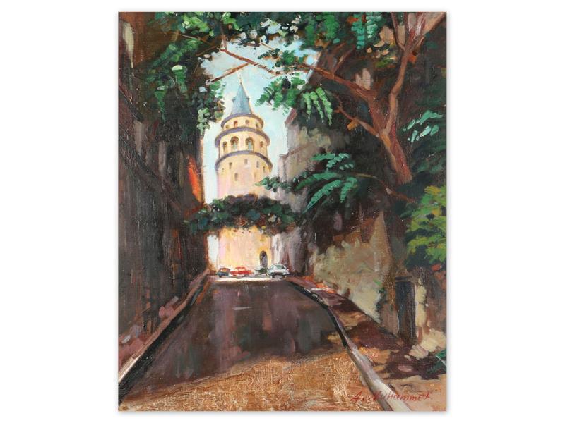 GALATA KULESİ. TUAL ÜZERİ YAĞLIBOYA. A.MUHAMMET İMZALI. 60X50 CM.