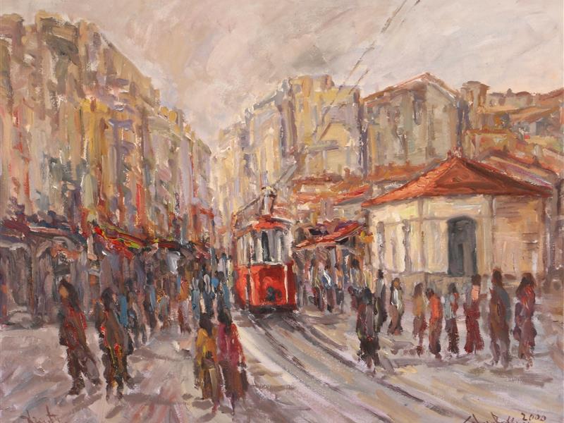 İSTİKLAL CADDESİ. TUAL ÜZERİ YAĞLIBOYA. (SÜLEYMAN ŞAHİN) ÇOBAN RESSAM İMZALI. 2000 T. 60X75 CM.