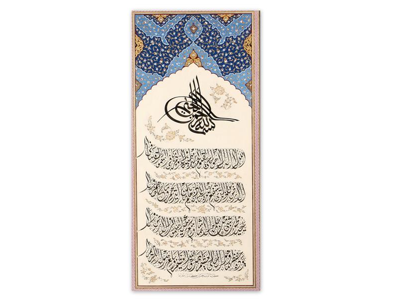 CELİ DİVANİ HATLA AYET EL KÜRSİ YAZILI. TESHİB MERAL ILGAZ TARAFINDAN YAPILMIŞ OLUP ESERİN İÇ TEZYİNATI RUMİ HATAYİ YAPRAK VE ÇİÇEK MOTİFLERİYLE KLASİK USLÜPDA, DIŞ PERVAZI İSE ALTINLA HALKARİ TARZINDA TEZHİPLENMİŞ ESERİN SATIR ARALARINA ALTINLA HALKARİ ÜSLÜPTA MOTİFLER YAPILMIŞTIR. KOLEKSİYONLUK BİR ESERDİR. 70X40 CM.