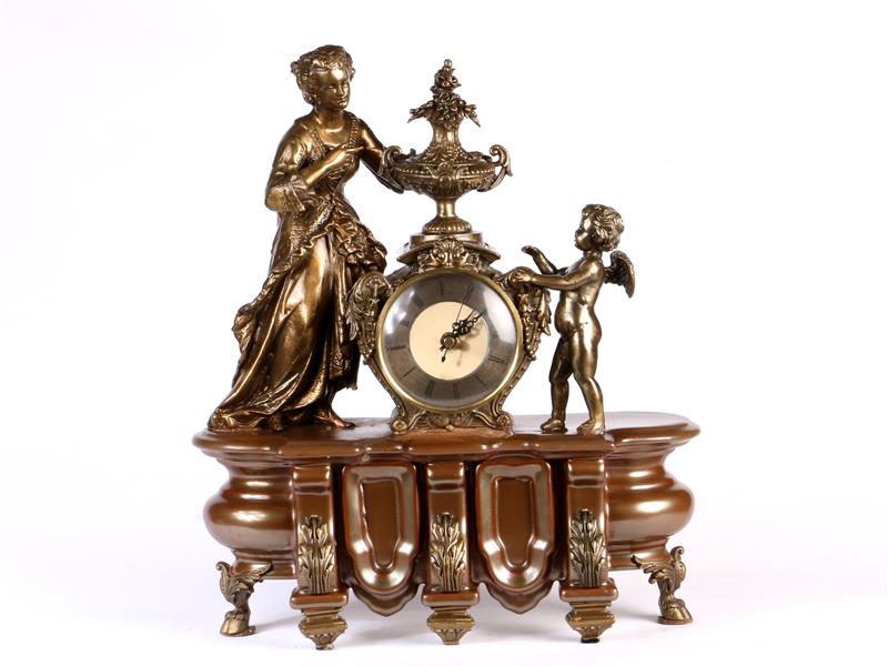 SERAMİK KAİDE ÜZERİ KADIN VE CUPİD FİGÜRLERİ İLE DEKORLU. ROMEN RAKAMLI KADRANLI. 35X42X13 CM.