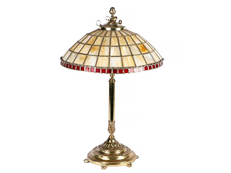 TİFFANY TARZI. BRONZ GÖVDE ÜZERİ, KABARTMA MOTİFLERLE DEKORLU. ŞAPKA KISMI VİTRAY İŞÇİLİKLİ. 3 LAMBALI. H 75 CM. ÇAP 45 CM.