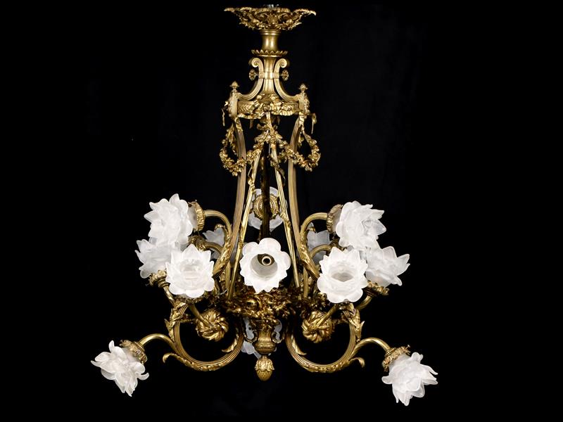 FRANSIZ. 19-20.YY. KUPADAKİ ÇİÇEKLERİN MEYDANA GETİRDİĞİ GÖVDE ZARİF KIVRIK FORMLU 15 KOL VE 15 LAMBA İLE BAĞLANTILI OLARAK SARKIK GİRLANDLARLA BİRLEŞMİŞ. H 90 CM. ÇAP 70 CM.