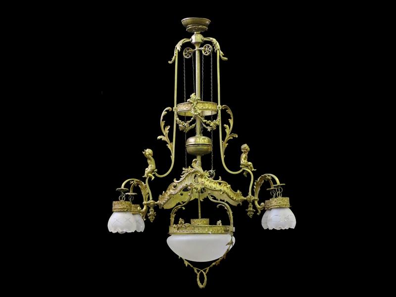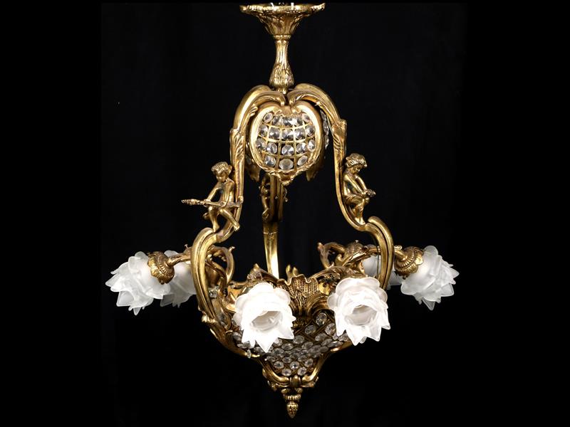 FRANSIZ. 19-20.YY. ASANSÖRLÜ. AKANTÜS YAPRAKLARI VE GİRLANDLARLA DEKORLU KOL TİJLERİNDE BRONZ ÇOCUK HEYKELLERİ APLİKELİ. 4 KOLLU VE 5 LAMBALI. H 130-170 CM.
