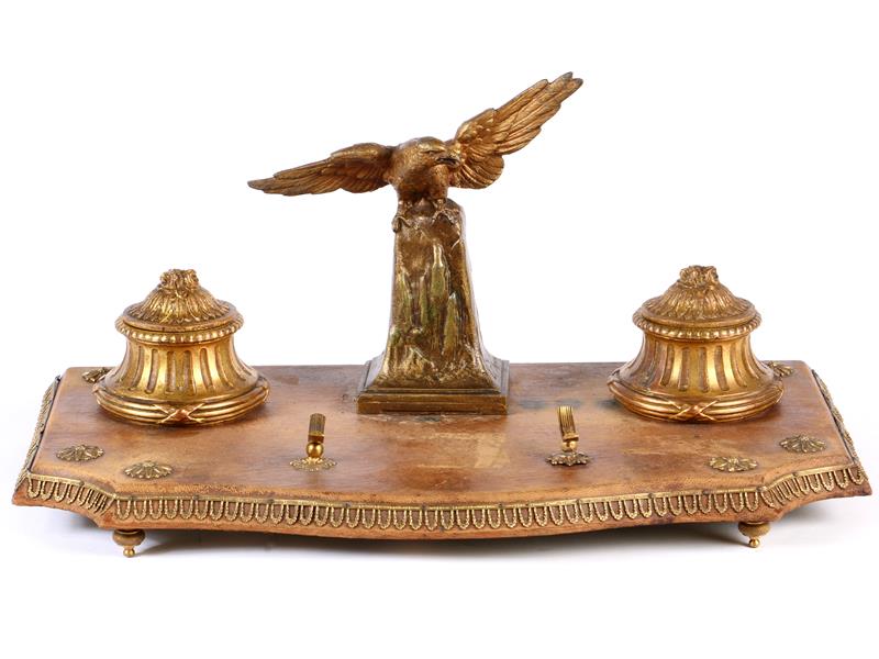 FRANSIZ. 19 YY. L.F.MOREAU İMZALI. DİKDÖRTGEN FORMLU, ÇİFT BRONZ MÜREKKEP HAZNELİ. ORTA KISIM KAİDE ÜZERİNDE KARTAL FİGÜRÜ. 35X19X19 CM.