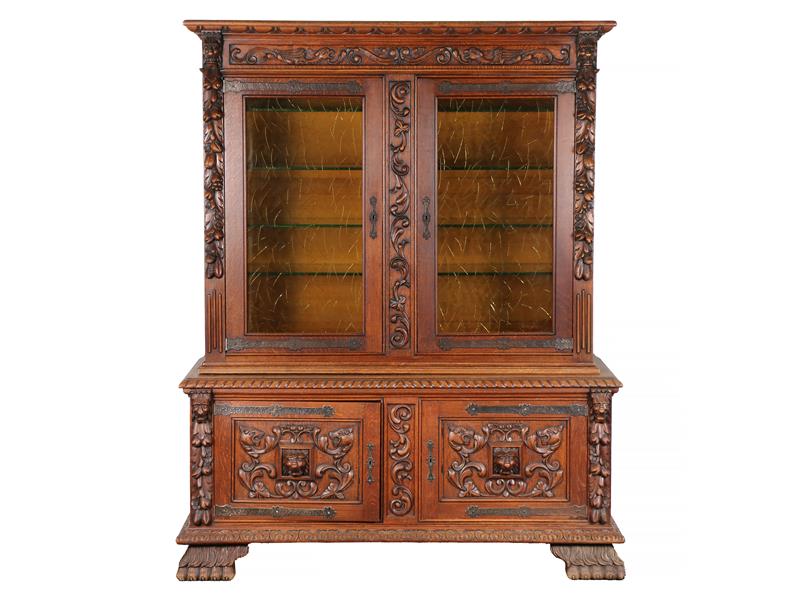 BATI AVRUPA. RÖNESANS TARZI. KABARTMA MUHTELİF FİGÜR VE ÇİÇEKLERLE DEKORLU. 2 CAM, 2 AHŞAP KAPILI. 3 CAM RAFLI. 150X185X53 CM.