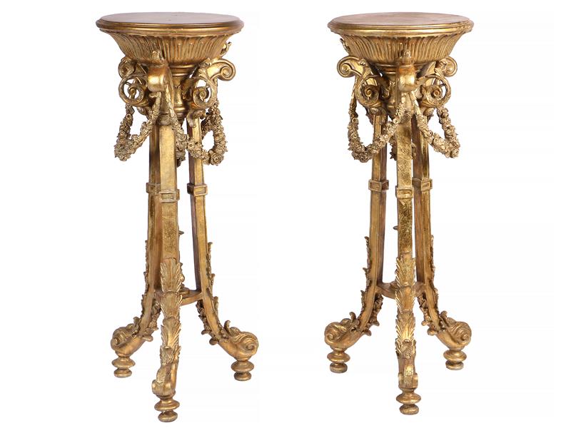 FRANSIZ. ORTADAN BAĞLANTILI ÜÇ AYAK ÜZERİ YUVARLAK FORMLU TABLA İLE BAĞLANTILI GİRLANDLAR VE AKANTÜS YAPRAKLARI İLE DEKORLU. H 117 CM - ÇAP 44 CM.