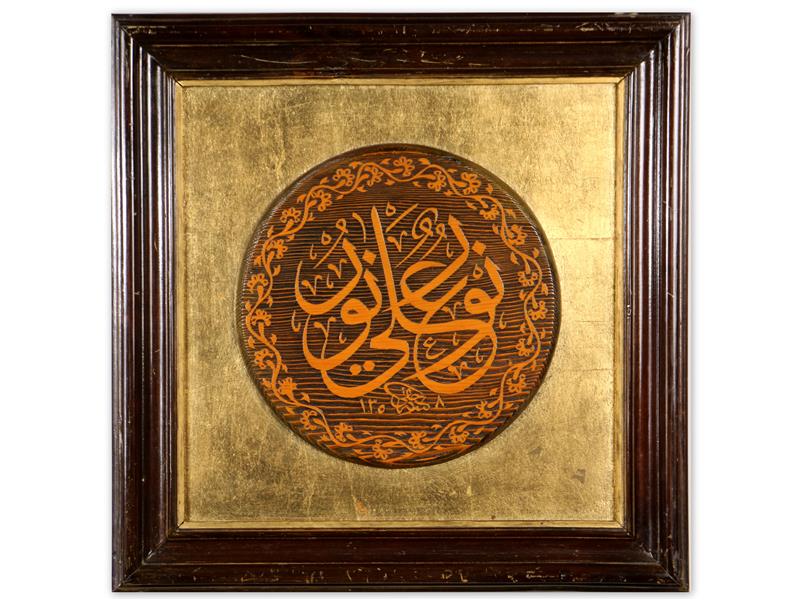 NUR ÜSTÜNDE NUR DUR YAZILI. TUĞRAKEŞ İSMAİL HAKKI ALTUNBEZER (1873-1940). İSTİF CELİ SÜLÜS HATTININ ASLINDAN KOPYA EDİLEREK NAİL ARIKDAN TARAFINDAN AHŞABA ÇALIŞILMIŞTIR. ÇAP 30 CM.