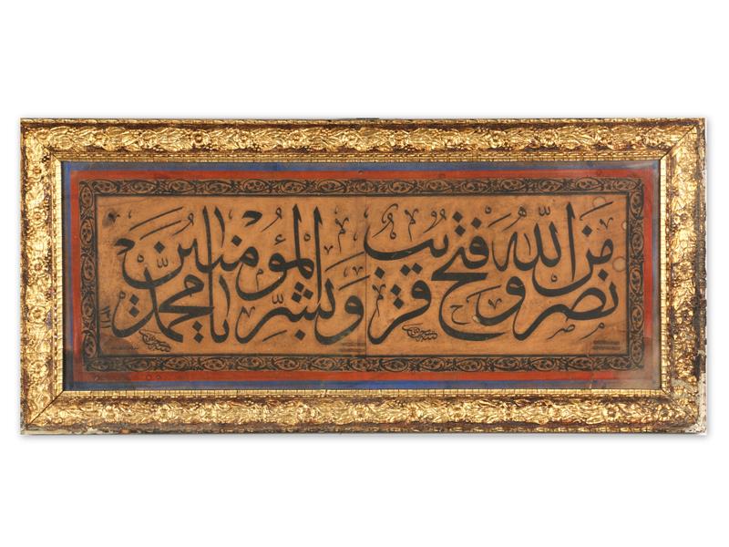 CELİ SÜLÜS HATLA SAFF SURESİ. 13. AYET YAZILI. HÜSNİ KETEBELİ. 1311 T. 31X81 CM.