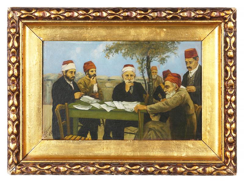 OSMANLI FİGÜRLER. TUAL ÜZERİ YAĞLIBOYA. İMZALI. 1930 T. 26,5X42,5 CM. ORİJİNAL ÇERÇEVESİNDE.