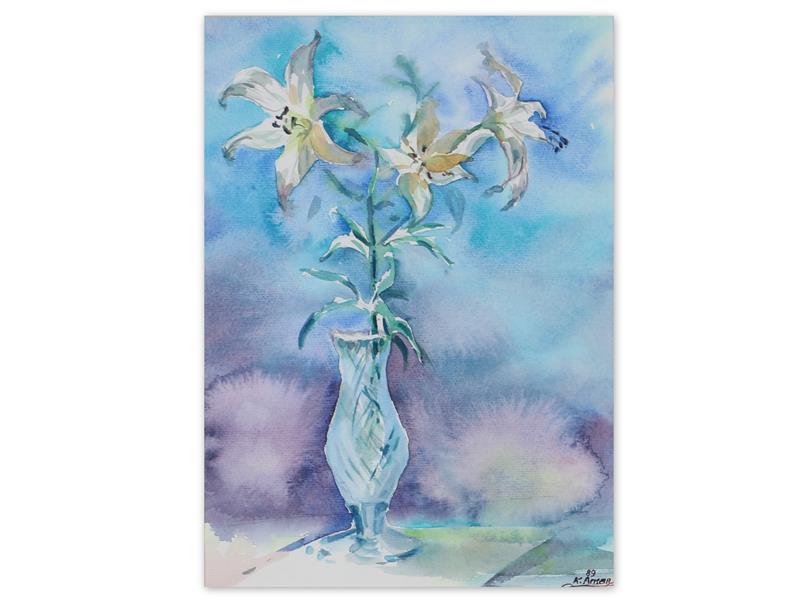 VAZODA ÇİÇEKLER. KARTON ÜZERİ SULUBOYA. K.ARISAN İMZALI. 1989 T. 38X27 CM. JİNEKOLOG, RESSAM, YAZAR.