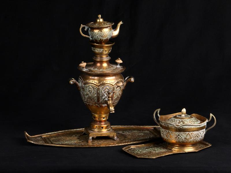 5 PARÇA. KABARTMA VE KALEM İŞÇİLİKLİ. ÇİFT TUTAMAK VE TEK MUSLUKLU. SEMAVER H 28 CM. ŞEKERLİK ÇİFT TUTAMAKLI KAPAKLI. H 6,5 CM. ÇAP 11 CM. 2 ADET TEPSİ 20X12 CM. 36X17 CM.