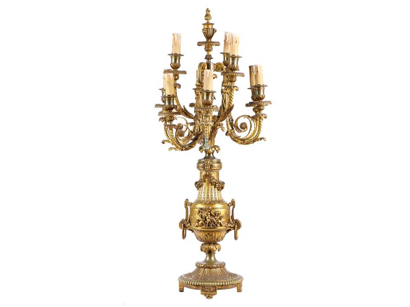 FRANSIZ. 19-20.YY. 4 AYAKLI YUVARLAK KAİDELİ. KUPA FORMLU GÖVDEDE FİGÜR VE GİRLANDLARLA APLİKELİ. KIVRIK DAL VE YAPRAKLARLA 9 KOLLU, 9 LAMBALI. H 84 CM.