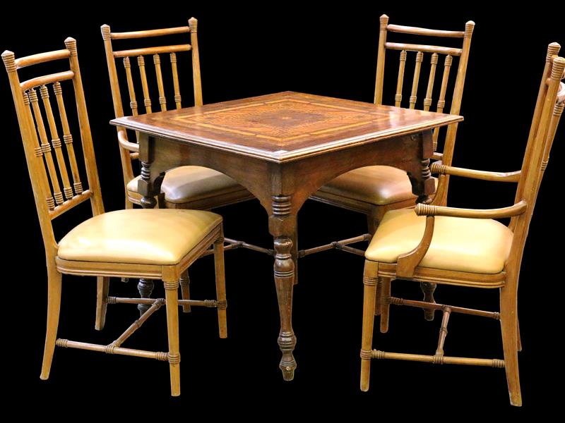 MASA KARE TABLALI VE MARKÖTERİ ÇALIŞMALI. 87X87 CM. H 74 CM. OTURMA YERİ DERİ KAPLI 2 KOLTUK VE 2 SANDALYE.