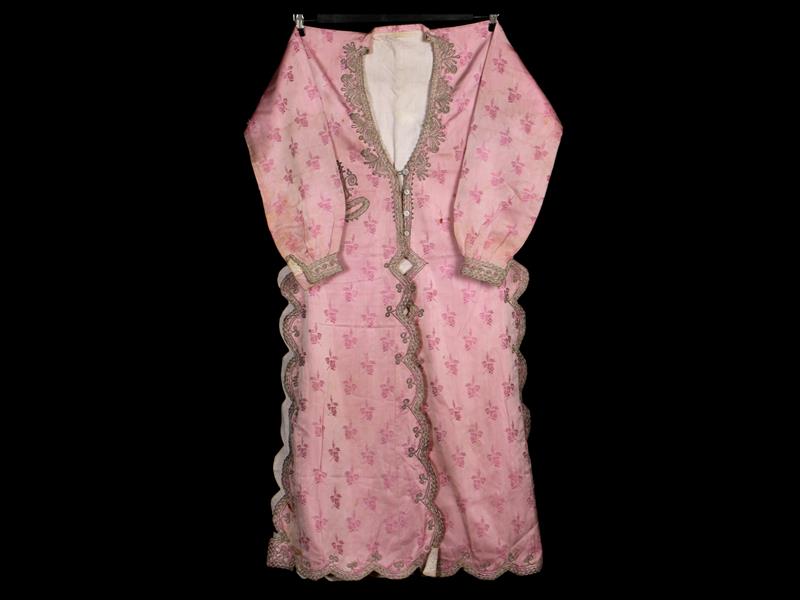 19.-20.YY. PEMBE HEREKE KUMAŞLI. KENARLAR GÜMÜŞ TEL SIRMA İŞLEMELİ. H 110 CM.