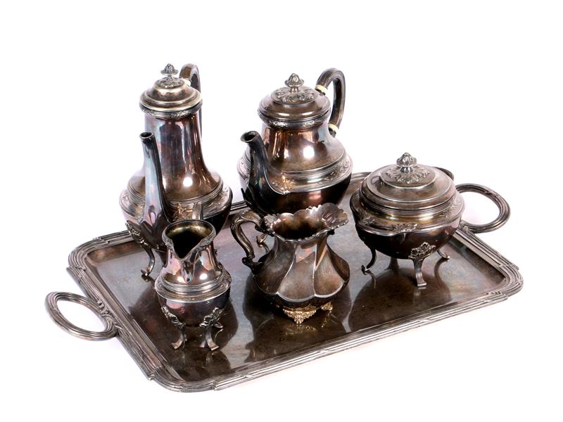 AMERİKAN. 19-20. YY. MERİDEN BRİTANİA CO İMALAT DAMGALI. 2 DEMLİK, 2 SÜTLÜK, ŞEKERLİK, VE TEPSİ. TEPSİ 55X33 CM.