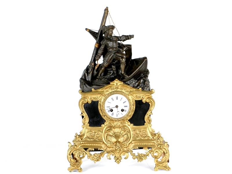 FRANSIZ. TEKNEDE ŞOVALYE HEYKELLİ. ROMEN RAKAMLI, EMAYE KADRANLI. TAM VE YARIMLARDA ÇALAR. 52X32X11 CM.