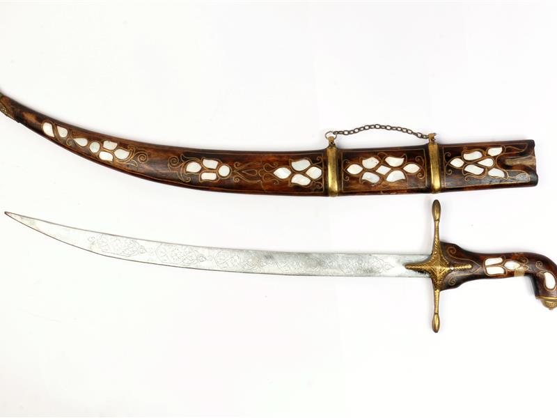 SEDEF KAKMALI. PİRİNÇ TEL GEÇMELİ. AHŞAP KINLI. UZ 86 CM.