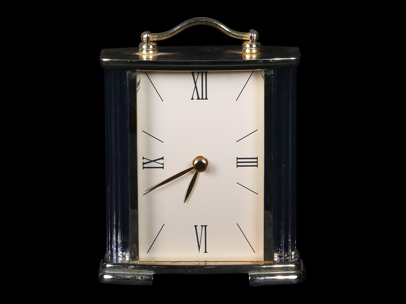 PİRİNÇ KASALI. ŞEFFAF KADRANLI VE ROMEN RAKAMLI. 15X18,5X7,5 CM.