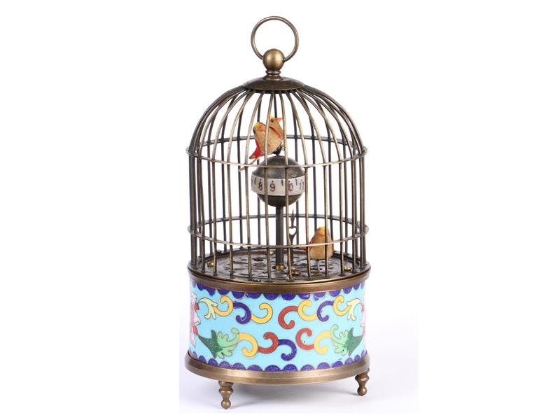 KUŞ KAFESİ FORMUNDA, KURMALI VE HAREKETLİ. KAFES ALT KISMI SOĞUK MİNE İŞÇİLİKLİ. H 18 CM.