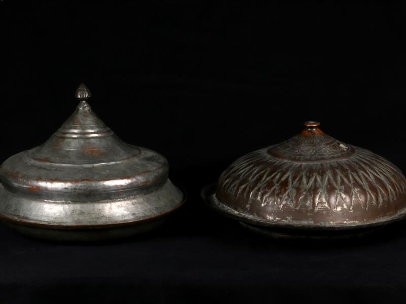 19.YY. MUHTELİF KALEM VE KABARTMA İŞÇİLİKLİ. 1 ADET KAPAK VE 1 ADET TABAK OSMANLICA YAZILI. H 20 CM. ÇAP 32 CM. / H 20 CM ÇAP 28 CM / H 18 CM. ÇAP 36,5 CM.