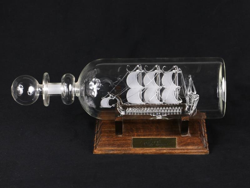KARAF İÇİ CAM KALYON MAKETİ MONTELİ. AHŞAP KAİDESİ MEVCUT. H 27 CM.