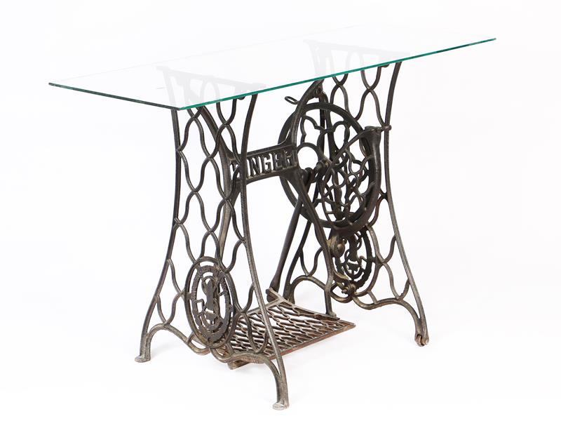 SİNGER DİKİŞ MAKİNESİ AYAĞINDAN MAMÜL. DİKDÖRTGEN CAM TABLALI. CAM TABLA 112X40 CM. H 72 CM.