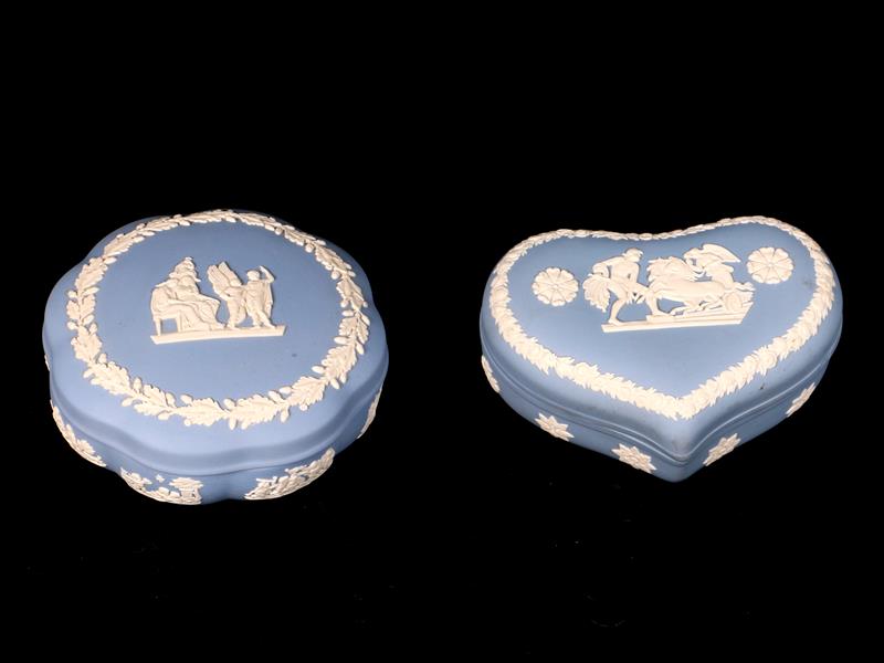 İNGİLİZ. WEDGWOOD. İMALAT DAMGALI. KALP VE YUVARLAK FORMLU. MAVİ ZEMİN ÜZERİ RÖLYEF ÇALIŞMALI.13X9 CM. ÇAP 13 CM.
