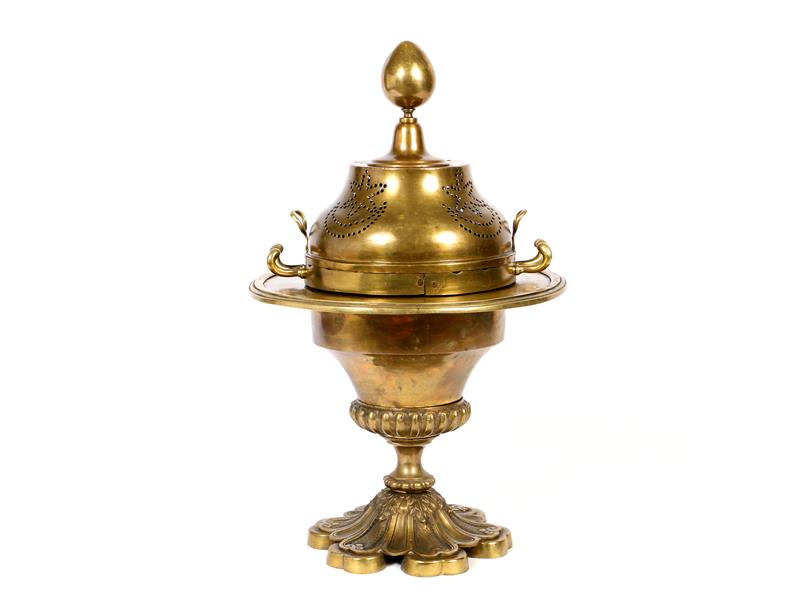 SÜLEYMANİYE İŞİ. USTA DAMGALI. DİLİMLİ AYAKLI. KABARTMA İŞÇİLİKLİ. KÖMÜR HAZNESİ VE KAPAK MEVCUT. ÇİFT TUTAMAKLI VE KAPAK ÜZERİ AYYILDIZ MOTİFLİ. H 73 CM. TEPSİ ÇAP 46 CM.