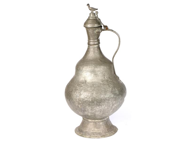 AFYON İŞİ. YUVARLAK KAİDE ÜZERİ ŞİŞKİN GÖVDELİ. TEK TUTAMAKLI. KAZIMA VE KABARTMA İŞÇİLİKLİ MOTİFLERLE DEKORLU. KAPAK ÜZERİ KUŞ FİGÜRLÜ APLİKELİ. H 56 CM.