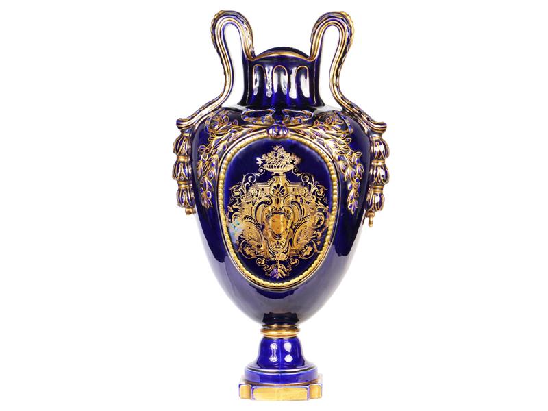KUPA FORMLU. KARE KAİDE ÜZERİNE ŞİŞKİN GÖVDELİ. KOBALT ZEMİN ÜZERİ ALTIN YALDIZ MOTİFLERLE DEKORLU. H 57 CM.