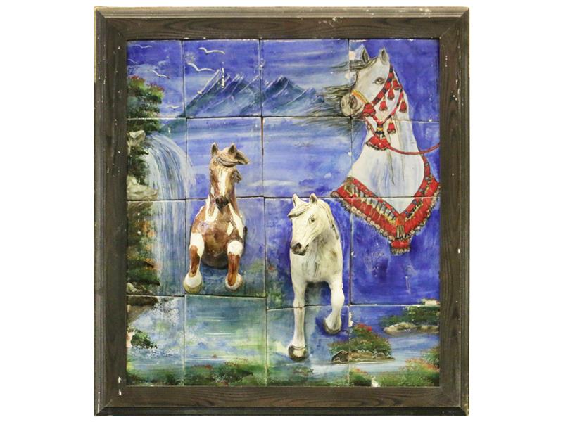 16 PARÇA ÇİNİ ÜZERİNDE PEYZAJDA KABARTMA ATLAR RESMEDİLMİŞ. 55X49 CM.