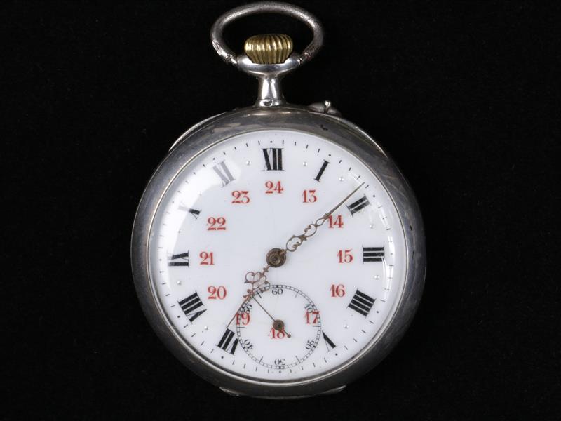 935 GÜMÜŞ DAMGALI. ÜSTTEN KURMALI, SANİYE GÖSTERGELİ VE ROMEN RAKAMLI. PORSELEN MİNE KADRANLI. 125205 SERİ NUMARALI. TOZ KAPAĞI GÜMÜŞ. ÇAP 45 MM. YARI KIYMETLİ TAŞ APLİKELİ KÖSTEK ZİNCİRİ MEVCUT. UZ 25 CM.