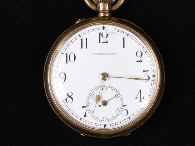 ÜSTTEN KURMALI. SANİYE GÖSTERGELİ. PORSELEN MİNE KADRANLI. 23239 SERİ NUMARALI. ÇAP 50 MM. DOĞAL TAŞ APLİKELİ ALTIN KAPLAMA KÖSTEK ZİNCİRİ MEVCUT. UZ 18 CM.