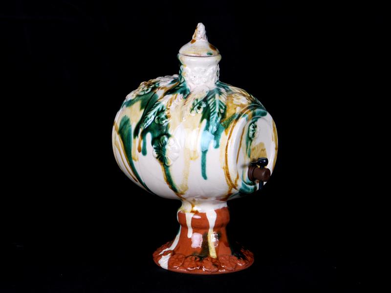 KIRMIZI HAMURLU. ÜZERİ BEYAZ ASTAR VE ŞEFAF SIRLI. YUVARLAK KAİDE ÜZERİNE MONTELİ. TEK MUSLUKLU. KABARTMA MOTİFLERLE DEKORLU. H 24 CM.