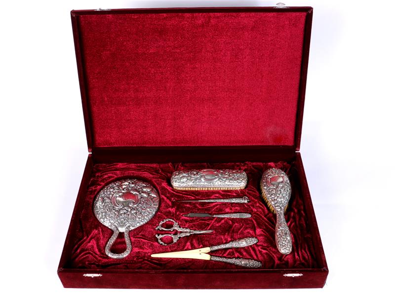 İNGİLİZ İMALAT DAMGALI. 7 PARÇA. GÜMÜŞ KABARTMA İŞÇİLİKLİ. İNİSİYALLİ. ORİJİNAL KUTUSUNDA.