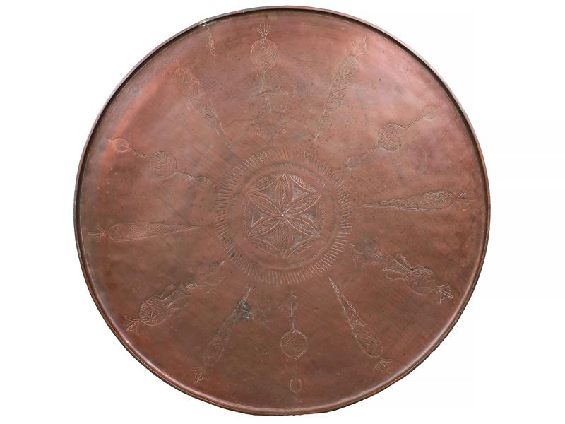 YUVARLAK FORMLU. KAZIMA İŞÇİLİKLİ MOTİFLERLE DEKORLU. ÇAP 89 CM.
