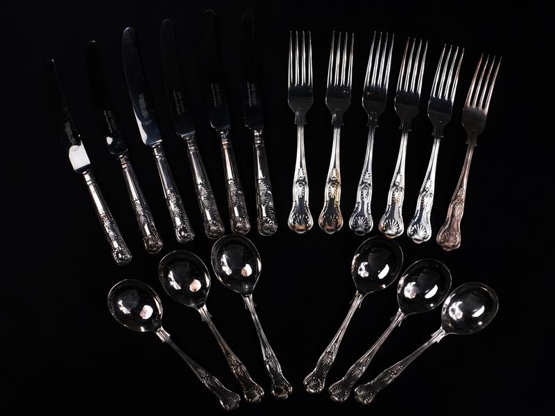 İNGİLİZ. SHEFFIELD İMALAT DAMGALI. 6 ADET ÇATAL, 6 ADET KAŞIK, 6 ADET BIÇAK. UZ 17,5-25 CM.