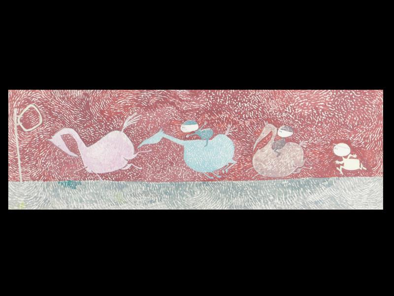 ÇOCUKLAR. KARTON ÜZERİ SULUBOYA. ANONİM.11X33 CM.