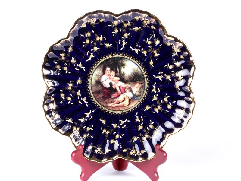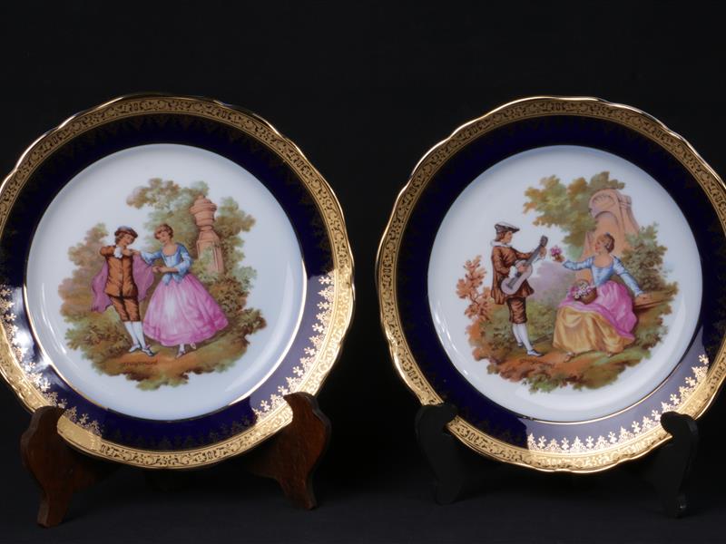 FRANSIZ. LİMOGES İMALAT DAMGALI. TABAK İÇİ FİGÜRLER İLE, KENARLAR KOBALT ÜZERİ ALTIN YALDIZ DEKORLU. ÇAP 25 CM.