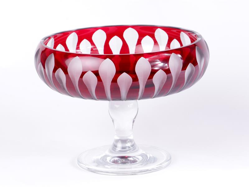 KESME KRİSTAL. ŞİŞKİNCE YUVARLAK FORMLU. BORDO RENKLİ. ŞEFFAF SAPLI. H 18 CM. ÇAP 22 CM.