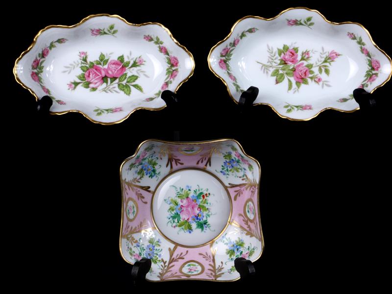 FRANSIZ. LİMOGES İMALAT DAMGALI. OVAL FORMLU 2 ADET KASE. İÇİ VE KENARLARI ÇİÇEK DESENLİ VE ALTIN YALDIZ DEKORLU. 17-11 CM. KARE FORMLU ÇEREZLİK. MUHTELİF RENKLİ ÇİÇEK VE ALTIN YALDIZ EL DEKORLU. 13X13X5 CM.