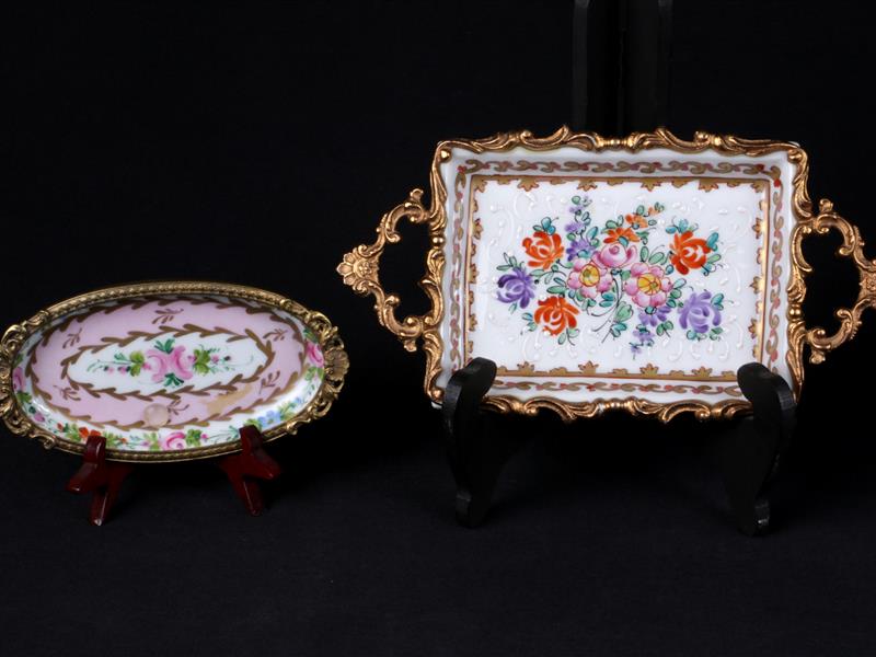 FRANSIZ. LİMOGES İMALAT DAMGALI. OVAL FORMLU ÇEREZLİK BRONZ ÇERÇEVELİ. TABAK İÇİ MUHTELİF RENKLİ ÇİÇEKLERLE EL DEKORLU.14-7,5 CM. DİKDÖRTGEN FORMLU TEPSİ. BRONZ ÇERÇEVELİ VE ÇİFT TUTAMAKLI. TABAK İÇİ MUHTELİF RENKLİ ÇİÇEKLERLE EL DEKORLU. 21-11 CM.