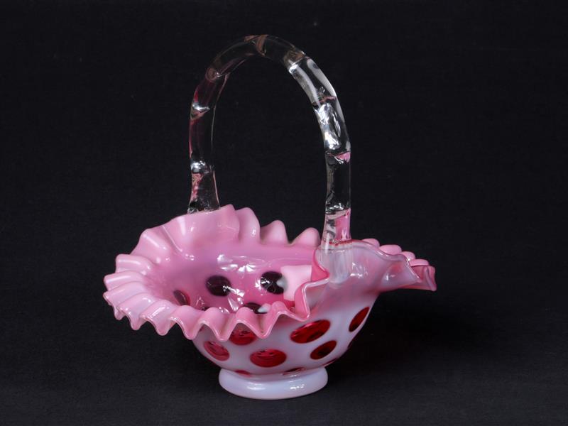 SEPET FORMLU. GÖVDE BEYAZ BORDO DESENLİ. İÇİ PEMBE RENKLİ ŞEFFAF TUTAMAKLI. H 20 CM. ÇAP 18 CM.