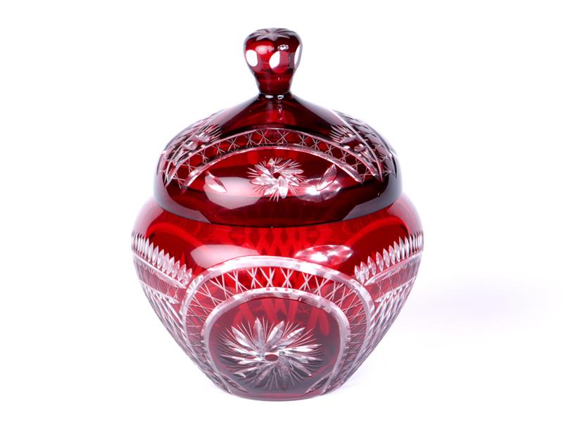 KESME KRİSTAL. BORDO RENKLİ. ŞİŞKİN GÖVDELİ VE KAPAKLI. H 16 CM. ÇAP 11 CM.