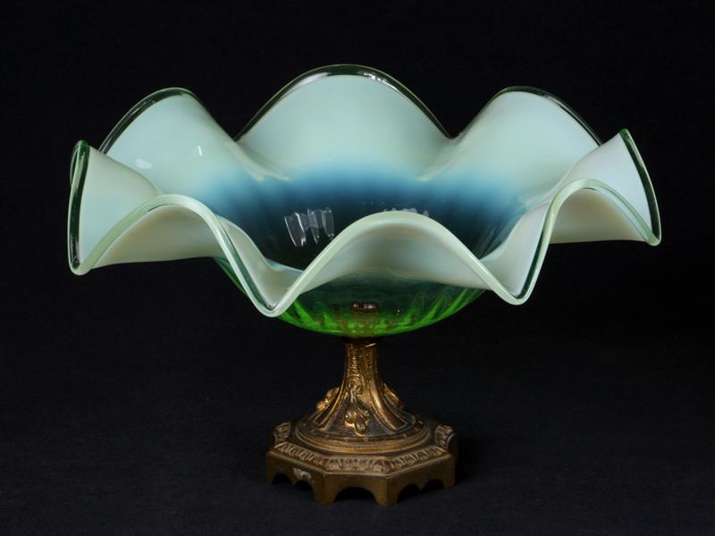 BRONZ KAİDEYE MONTELİ OPALİN GÖVDE YUVARLAK VOLANLI FORMLU, GEÇİŞLİ ÜÇ RENKLİ. ÇAP 23,5 ÇAP H 14 CM.