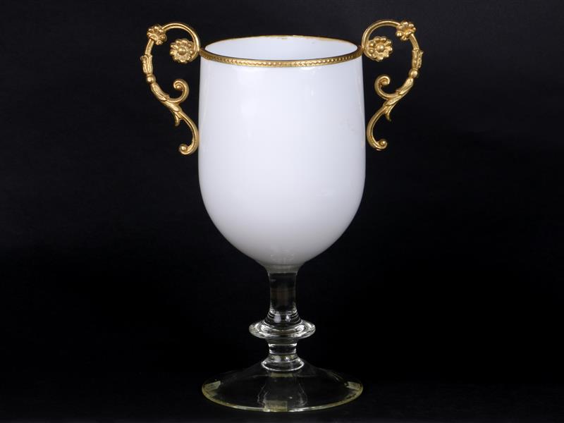 KUPA FORMLU. ŞEFFAF SAPLI. SÜT BEYAZ RENKLİ GÖVDE PİRİNÇ ÇİFT TUTAMAKLI. H 30 CM. ÇAP 13 CM.