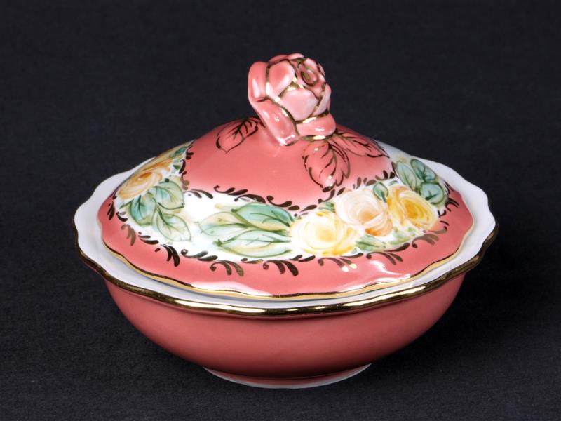 MİLLİ SARAYLAR. YILDIZ PORSELEN İMALAT DAMGALI. MÜNİR.Ş. SANATÇI İMZALI. 2000 TARİHLİ. KAPAK ÜZERİ GÜL FORMLU TUTAMAKLI. ÇİÇEKLERLE VE ALTIN YALDIZ EL DEKORLU. H 10 CM. ÇAP 12,5 CM.