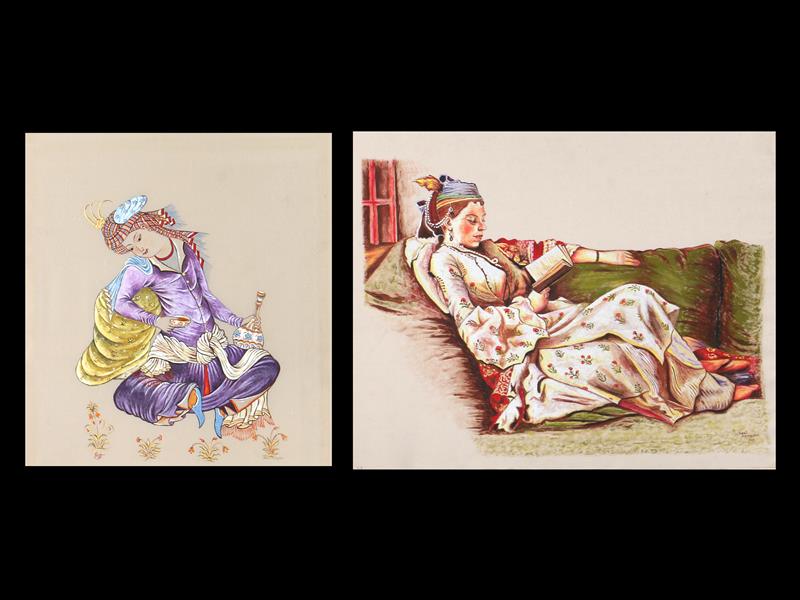 KARAF TUTAN KADIN. İPEK ÜZERİ KARIŞIK TEKNİK. İMZALI. 40X34 CM. KİTAP OKUYAN KADIN. İPEK ÜZERİ KARIŞIK TEKNİK. İMZALI. 2011 T. 33X41 CM.